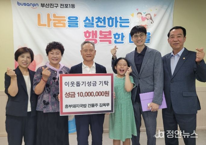정안뉴스 황정혜 기자 | 부산진구 전포1동에 소재한 흥부돼지국밥(전포대로200번길 24) 건물주 김옥무님이 8월 26일, 어려운 이웃을 위해 써달라며 성금 1,000만 원을 전포1동주민센터에 기탁했다.