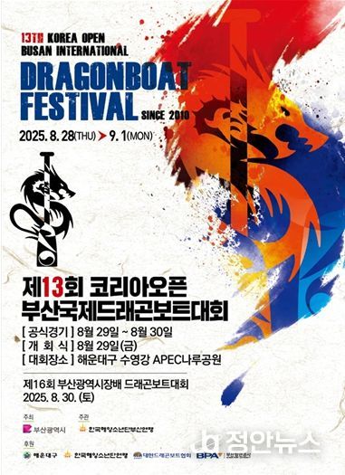 정안뉴스 황정혜 기자 | 부산시는 오늘(28일)부터 9월 1일까지 5일간 수영강 에이펙(APEC) 나루공원 일원에서 '제13회 코리아오픈 부산국제드래곤보트대회 및 제16회 부산광역시장배 드래곤보트대회'를 개최한다고 밝혔다.