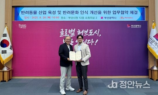 정안뉴스 황정혜 기자 | 부산시는 반려동물 산업 육성과 반려 문화 인식 개선을 위해 어제(28일) 반려동물 장례식장 브랜드 '포포즈'를 운영하는 ㈜펫닥과 업무협약을 체결했다고 밝혔다.