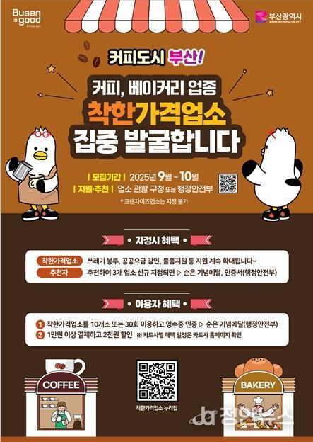 정안뉴스 황정혜 기자 | 부산시는 오는 9월부터 10월까지 두 달간 시민 생활과 밀접한 카페․제과점 업종을 대상으로 '착한 가격업소'를 집중적으로 발굴한다고 밝혔다.