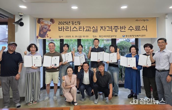 정안뉴스 안정주 기자 | 대구 중구 동인동행정복지센터는 지난 29일 동인세대공감마당(국채보상로149길 81)에서 ‘동인동 바리스타 교실 자격증반 수료식’을 개최했다.