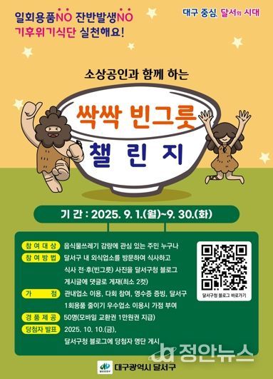 정안뉴스 안정주 기자 | 대구 달서구는 자원순환의 날(9월 6일)을 맞아 일회용품 사용을 줄이고 음식물쓰레기 감량 문화를 확산하기 위해 ‘용기내 챌린지’와 ‘싹싹 빈그릇 챌린지’ SNS 이벤트를 9월 1일부터 30일까지 진행한다.