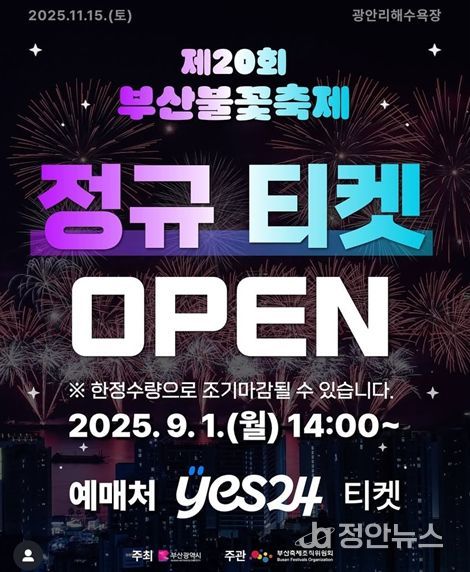 정안뉴스 황정혜 기자 | 부산시와 (사)부산축제조직위원회는 오는 11월 15일에 개최되는 '제20회 부산불꽃축제'의 유료좌석을 오늘(1일) 오후 2시부터 공식 판매한다고 밝혔다.