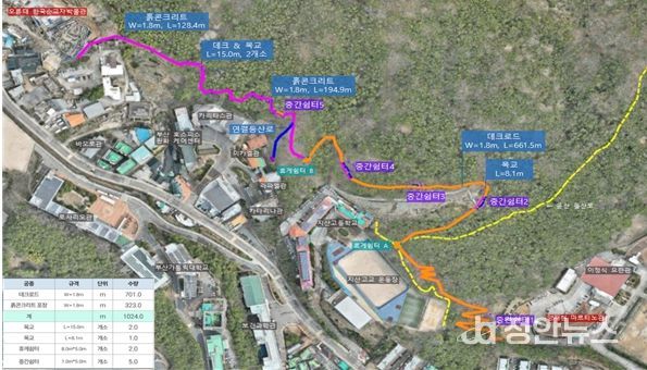 주요 시설은 ▲목교 3곳 ▲휴게 쉼터 2곳 ▲중간 쉼터 5곳을 비롯해 ▲종합·테마 안내판 ▲방향 표지판 ▲벤치 등 보행 약자를 배려한 편의시설이 포함된다.
