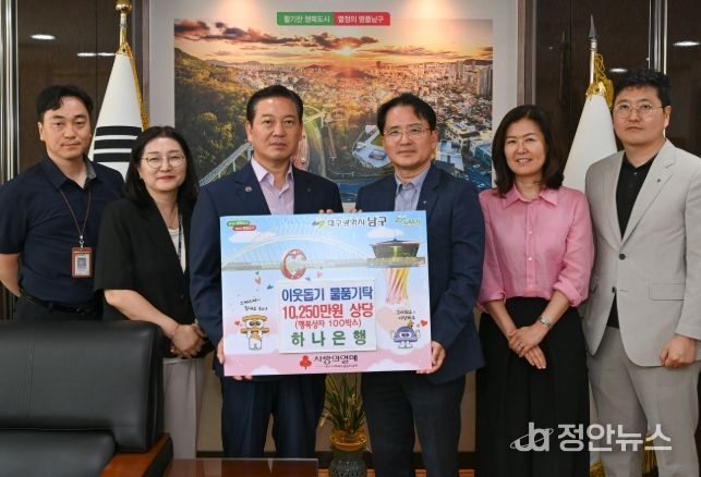 정안뉴스 안정주 기자 | 대구 남구는 지난 8월 27일, 하나은행(은행장 이호성)에서 지역 내 저소득 취약계층을 위한 ‘사랑의 행복상자’ 100박스(10,250만원 상당)를 기탁했다고 밝혔다.