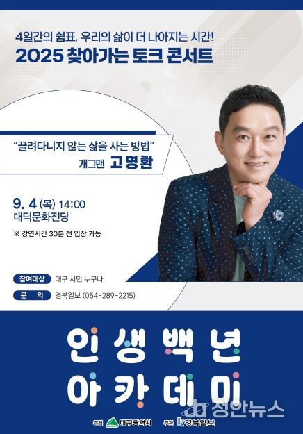 정안뉴스 안정주 기자 | 대구광역시는 ‘2025 인생백년 아카데미’를 상반기 두 차례의 강연에 이어 9월, 군위군과 남구에서 하반기 특강을 이어간다.