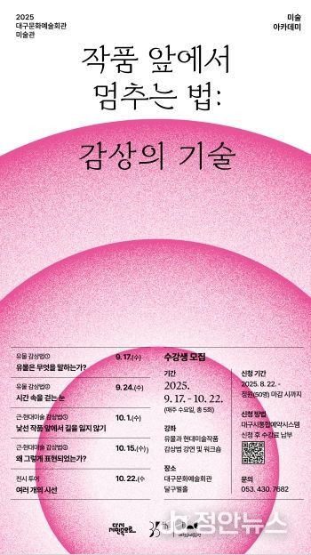 정안뉴스 안정주 기자 | 대구문화예술회관은 오는 9월 17일부터 10월 22일까지 매주 수요일 오후 2시, ‘2025 대구문화예술회관 미술 아카데미’를 운영한다.