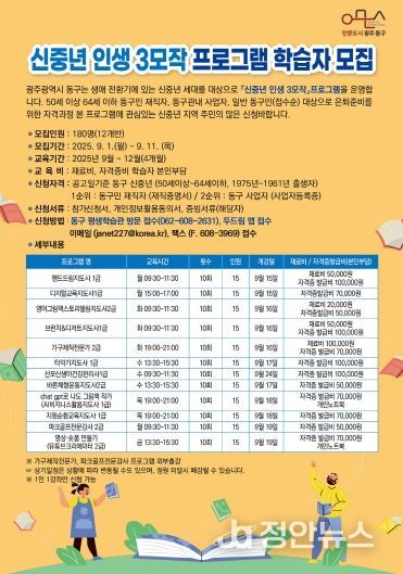 정안뉴스 안정주 기자 | 광주 동구는 생애전환기에 있는 신중년 세대(50세 이상~65세 이하)를 대상으로 노년기의 위기를 대비하기 위해 ‘신중년 인생3모작’ 지원 사업 운영, 9월 1일부터 학습자를 모집한다고 밝혔다.