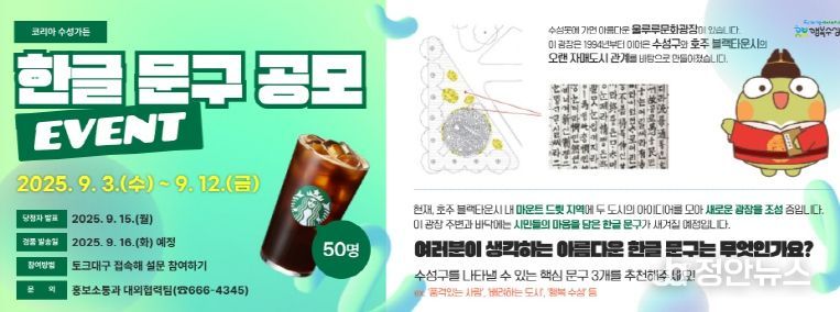 공모 기간은 9월 3일부터 9월 12일까지이며, 수성구청 홈페이지(누리집) 내 ‘토크대구’ 설문조사 알림창을 통해 누구나 참여할 수 있다. 참여자들은 수성구를 대표할 수 있는 한글 문구 3개를 자유롭게 추천할 수 있으며, 추첨을 통해 50명에게 커피 모바일 교환권을 증정한다.