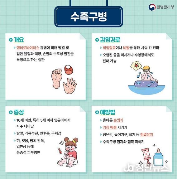 정안뉴스 안정주 기자 | 대구광역시는 9월 영유아를 중심으로 한 수족구병 발생 증가가 우려됨에 따라 영유아 가정과 보육시설에 예방수칙 준수를 당부했다.