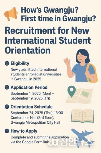 정안뉴스 안정주 기자 | 광주광역시는 오는 24일 오후 4시 시청 대회의실에서 지역대학에 입학한 외국인 유학생을 대상으로 ‘2025년 외국인 유학생 교육’을 연다.