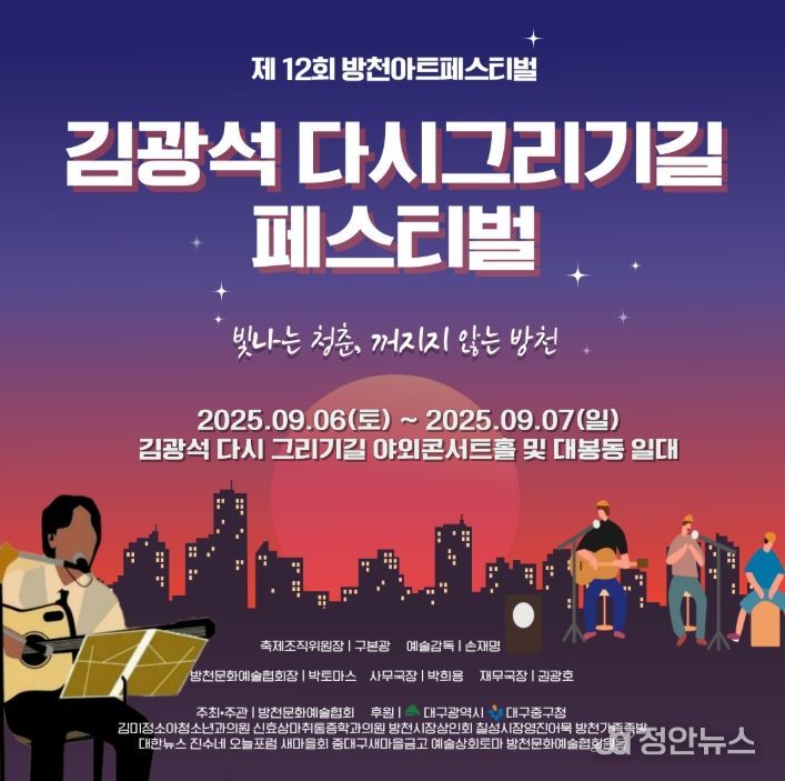 정안뉴스 안정주 기자 | 대구 중구는 9월 6일부터 7일까지 양일간 김광석다시그리기길과 방천시장 일원에서 ‘2025 김광석다시그리기길 페스티벌(제12회 방천아트페스티벌)’을 개최한다.