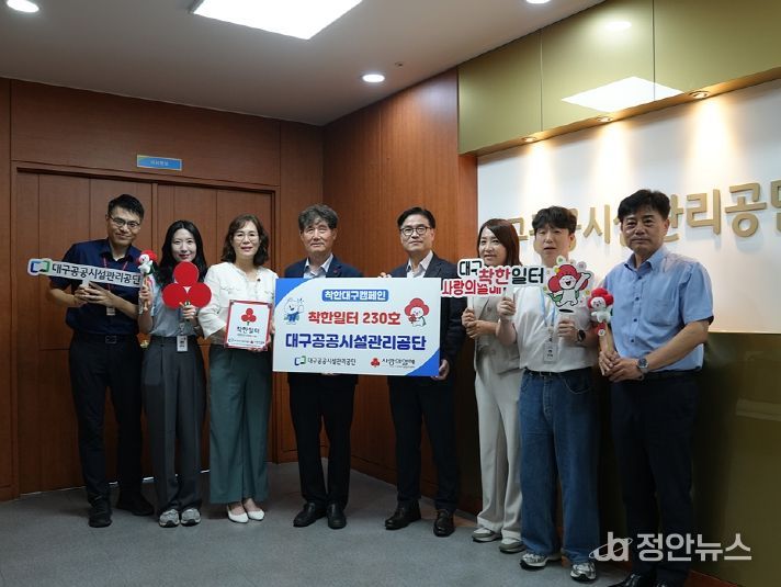 정안뉴스 안정주 기자 | 대구공공시설관리공단은 9월 2일 대명동 본사에서 사회복지공동모금회가 주관하는 ‘제230호 착한일터’에 가입하고 현판 전달식을 가졌다고 밝혔다.