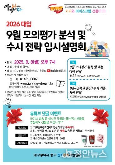 정안뉴스 안정주 기자 | 대구 중구진로진학지원센터(센터장 김남탁)는 오는 8일 오후 7시부터 9시까지 9월 모의평가 분석 및 대입 전략 입시설명회를 개최한다.