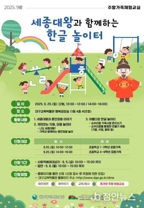 정안뉴스 안정주 기자 | 대구시교육청 산하 대구교육박물관은 제579돌 한글날을 기념하여 9월 20일, 어린이와 가족이 함께하는 특별한 가족 체험 프로그램을 운영한다.