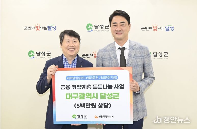 정안뉴스 안정주 기자 | 달성군은 지난 3일 신용회복위원회 대구·경북지역본부(본부장 이시형)로부터 500만 원 상당의 생필품을 전달받았다고 밝혔다.