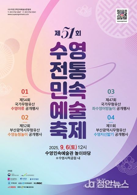 정안뉴스 황정혜 기자 | 부산시는 내일(6일) 정오에 시 무형유산 전수교육관인 '수영민속예술관 놀이마당'에서 무형유산의 보존과 원형 전승을 위해 '2025 제51회 수영전통민속예술제'를 개최한다고 밝혔다.