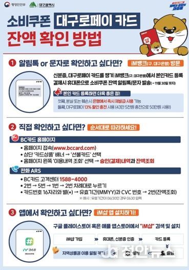 행정복지센터에서 발급받은 대구로페이 카드의 경우, 소비쿠폰 잔액 알림 서비스를 제공받기 위해서는 반드시 신분증과 카드를 지참해 iM뱅크 영업점에서 본인카드 등록(기명화) 절차를 마쳐야 한다.