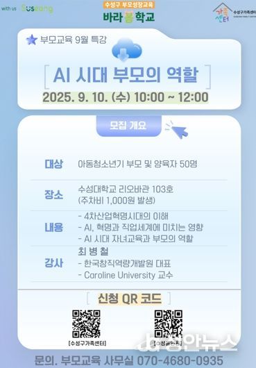 김대권 수성구청장은 “인공지능(AI) 시대에는 부모의 역할도 새롭게 변화해야 한다”며 “시대 흐름에 맞는 부모교육을 통해 자녀와 함께 성장할 수 있는 기반을 꾸준히 마련해 나가겠다”고 말했다.