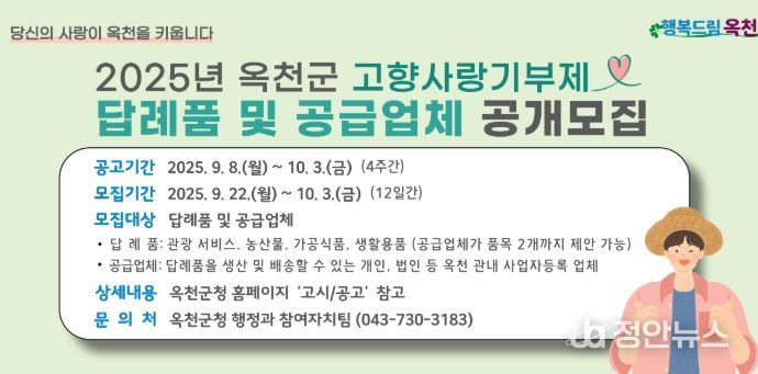 정안뉴스 황은경 기자 | 옥천군이 8일부터 한 달 동안 고향사랑기부제 답례품 및 공급업체 추가 모집한다. 공급업체가 공모를 통해 답례품목을 제안하면 답례품과 공급자를 동시 선정하는 방식이다.