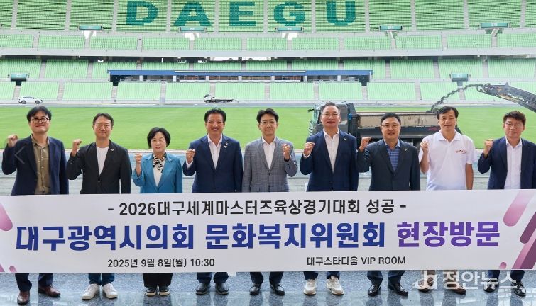 정안뉴스 안정주 기자 | 대구시의회 문화복지위원회는 제319회 임시회 기간 중인 9월 8일, 2026 대구세계마스터즈 육상경기대회를 1년 정도 앞두고 조직위원회(대구스타디움 내)를 방문해 시설 및 대회 준비 상황 등을 점검하는 시간을 가졌다.