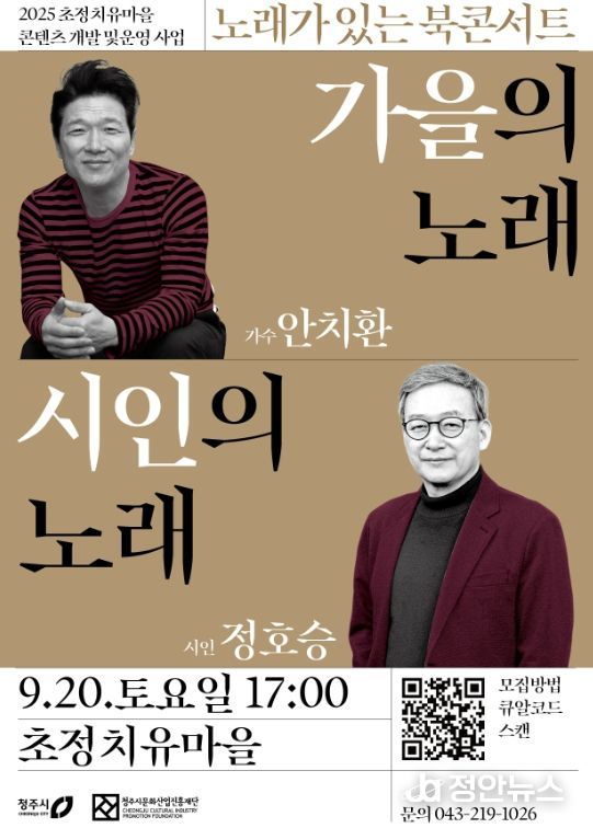 청주시와 청주시문화산업진흥재단은 ‘가수 안치환×시인 정호승의 노래가 있는 북콘서트’에 함께할 참여자를 모집한다고 8일 밝혔다.