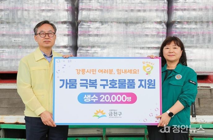 정안뉴스 안정주 기자 | 금천구가 최근 강원도 강릉 지역을 중심으로 발생한 극심한 가뭄피해를 돕기 위해 생수 2L 5,000병, 500ml 15,000병 총 2만 병을 긴급 지원한다고 밝혔다.
