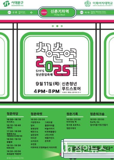 정안뉴스 안정주 기자 | 서대문구가 이달 11일 오후 4∼8시 신촌 청년푸드스토어(신촌역로 22-5)에서 이화여대와 함께 ‘청춘역 2025’를 개최한다.