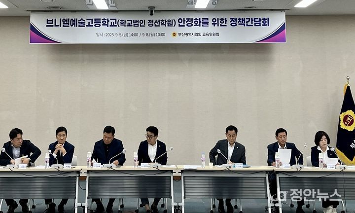 정안뉴스 안정주 기자 | 부산광역시의회 교육위원회는 9월 5일과 8일 양일간 시의회 대회의실에서 브니엘예술고등학교(학교법인 정선학원) 안정화 방안을 논의하기 위한 정책간담회를 개최했다.