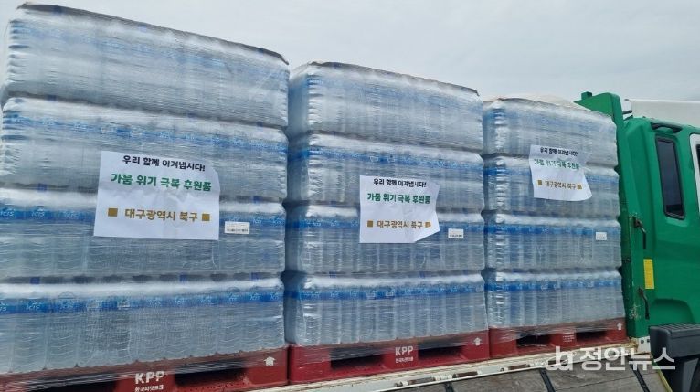 정안뉴스 안정주 기자 | 대구 북구청은 9월 9일 심각한 가뭄으로 생활용수 부족과 제한급수에 직면한 자매도시 강릉시에 긴급 구호물품으로 2리터 생수 3,726병을 지원했다.