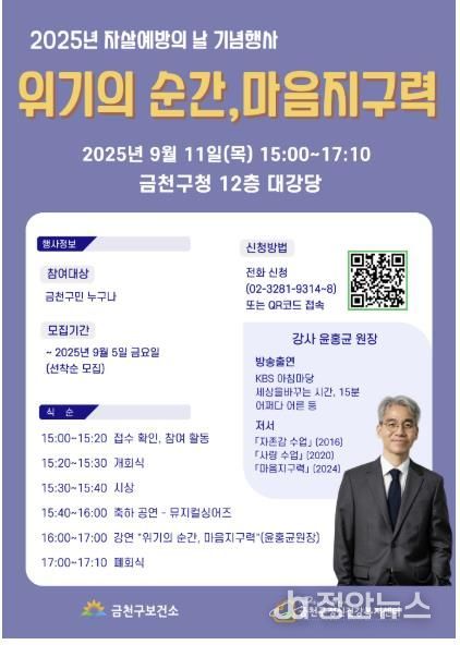 정안뉴스 안정주 기자 | 금천구는 10일 세계 자살예방의 날을 기념해 11일 오후 구청사 12층 대강당에서 기념행사를 개최한다고 밝혔다.
