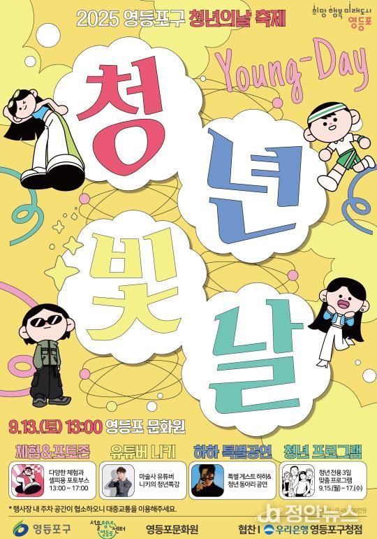 정안뉴스 안정주 기자 | 영등포구가 오는 13일 오후 1시 영등포문화원에서 청년의 날을 기념해 2025년 영등포 청년축제 ‘청년빛날, Young-Day’를 개최한다고 밝혔다.