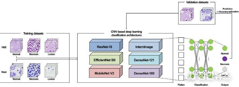 연구진은 뇌졸중을 유발한 전임상 동물모델의 뇌 조직 병리염색 영상에서 뇌졸중 병변과 괴사성 세포가 존재하는 영역을 탐지·분류를 위한 알고리즘에 가장 최적화된 딥러닝 영상 분류 모델들을 적용, 성능을 비교 분석했다.