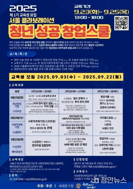 정안뉴스 안정주 기자 | 서대문구가 청년창업기업과 사회적경제기업, 예비창업자(소상공인) 등을 위해 이달 23∼25일 서대문청년창업센터(수색로 43)에서 ‘서울 콜라보레이션 청년 성공 창업스쿨’을 개최한다.