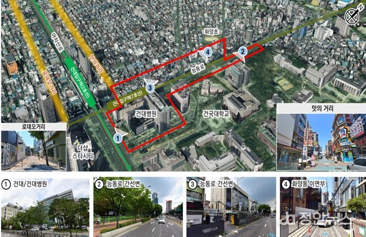 대상지는 지하철 환승역인 건대입구역을 포함하여 대중교통 이용이 편리하며, 주변에 건국대학교, 대학병원, 대규모점포 등이 입지한 지역이다. 또한, 이면부는 외식업, 패션잡화 중심의 저층 소규모 소매업이 밀집해 상권을 이루는 등 다양한 기능이 복합되어 있다.