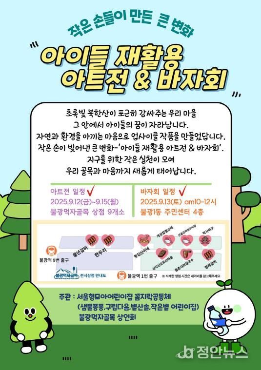 정안뉴스 안정주 기자 | 서울 은평구는 불광먹자골목 골목형상점가에서 오는 12일부터 15일까지 ‘아이들 재활용 아트전 · 바자회’를 개최한다고 밝혔다.