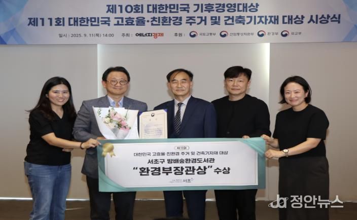 정안뉴스 안정주 기자 | 서울 서초구가 11일 에너지경제신문이 주관한 ‘제11회 대한민국 고효율·친환경 주거 및 건축기자재 대상’에서 서초구립 방배숲환경도서관이 환경부장관상을 수상했다고 밝혔다.