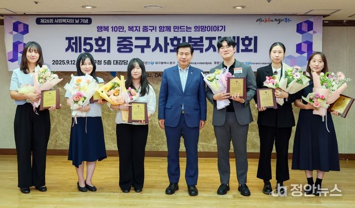 정안뉴스 안정주 기자 | 대구 중구는 12일 구청 대강당에서 제26회 사회복지의 날(9월 7일)과 사회복지주간을 기념해 사회복지 증진에 이바지한 종사자들의 노고를 격려하고, 2026년 시행 예정인 통합돌봄사업의 성공적 추진을 위한 ‘제5회 중구사회복지대회 및 통합돌봄 민관협력 세미나’를 개최했다.