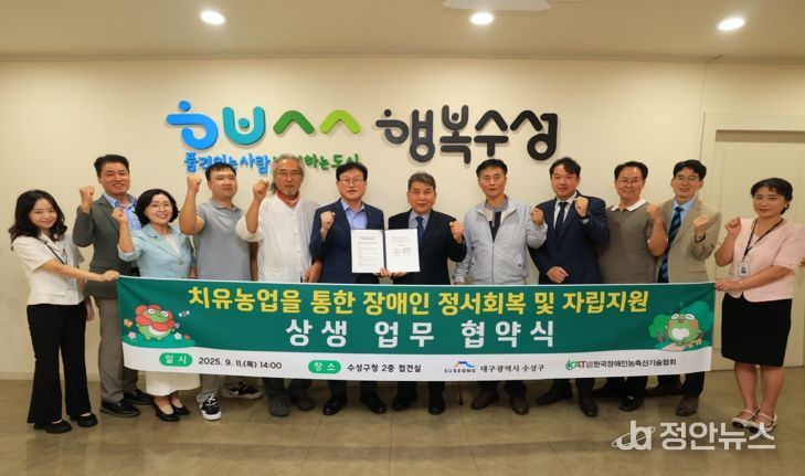 정안뉴스 안정주 기자 | 대구 수성구와 (사)한국장애인농축산기술협회 중앙회는 지난 11일 치유농업을 통한 장애인의 정서회복과 자립지원 상생 업무 협약(MOU)을 체결했다.