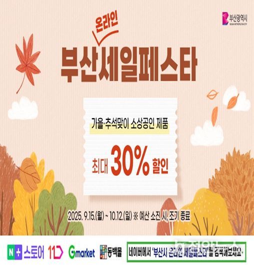 정안뉴스 황정혜 기자 | 부산시는 15일부터 10월 12일까지 약 한 달간 민족 대명절 추석을 맞아 '가을 추석맞이 부산세일페스타(온라인) 특별 할인전'을 진행한다고 밝혔다.
