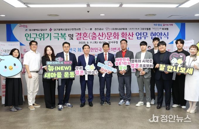 정안뉴스 안정주 기자 | 대구 달서구는 지난 11일 구청에서 대구광역시 달서구한의사회를 비롯한 6개 민간기관·단체와 결혼친화 문화 확산과 저출생 대응을 위한 업무협약을 체결했다.