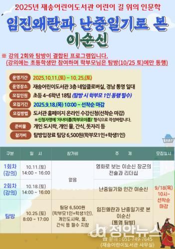 정안뉴스 황정혜 기자 | 해운대구는 ‘여행하는 어린이 길 위의 인문학’프로그램 ‘임진왜란과 난중일기로 본 이순신’참가자를 모집한다.