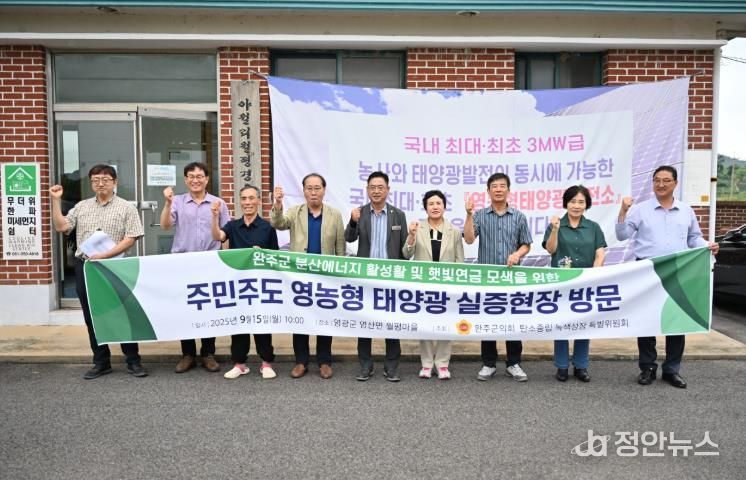 정안뉴스 안정주 기자 | 완주군의회 탄소중립 녹생성장 특별위원회는 지난 15일 전라남도 영광군 염산면 월평마을을 방문해 전국 최초이자 최대 규모로 조성된 영농형 태양광발전소 실증현장을 살펴보았다.