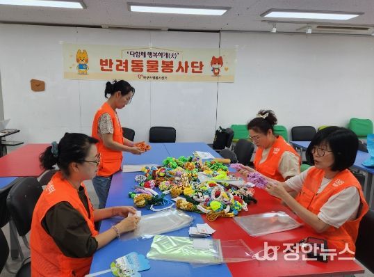 정안뉴스 황정혜 기자 | 부산북구자원봉사센터(센터장 강성환) 반려동물봉사단 ‘다함께 행복하개(犬)’는 지난 15일 부산 강서구 부산동물보호센터를 방문해 반려동물 양말목 장난감 50세트를 전달했다고 밝혔다.