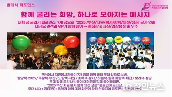 자원봉사자들이 객석에서 7개의 공을 무대 앞으로 굴려 배치하고, 내빈들이 손을 대면 ‘2025 부산 자원봉사 함께 체전 성공’이라는 슬로건이 펼쳐져, 모두가 힘을 모아 성공 체전을 만들어 간다는 상징적 메시지를 전한다.