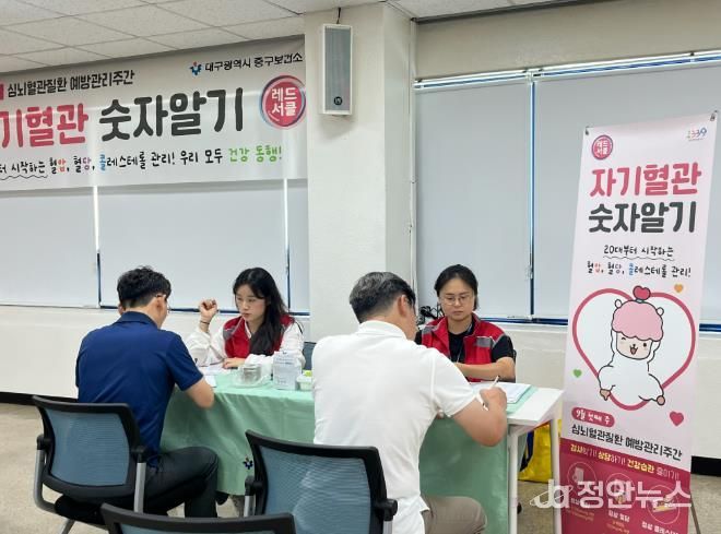 정안뉴스 안정주 기자 | 대구 중구보건소는 심뇌혈관질환 예방관리주간을 맞아 지난 16일 대성에너지(중구 명덕로 소재)에서 경북대학교병원 권역심뇌혈관질환센터와 함께 ‘자기혈관 숫자알기, 레드서클 캠페인’을 실시했다.