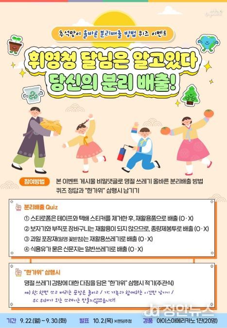 아울러, 이번 추석에는 ‘추석맞이 올바른 분리배출 OX퀴즈 이벤트’를 추진해 평소보다 많이 발생하는 분리배출 대상 쓰레기 처리 방법을 홍보하고, 쓰레기 감량 실천 다짐 댓글을 작성해 명절 기간 시민들의 자발적인 생활쓰레기 감량을 유도할 계획이다.