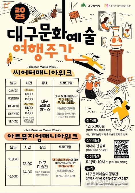 대구문화예술여행주간은 총 2가지 프로그램으로 국내유일의 제작극장인 대구오페라하우스에서 진행하는 씨어터매니아위크와 대구미술관에서 진행하는 아트뮤지엄매니아위크로 구성돼 있다.