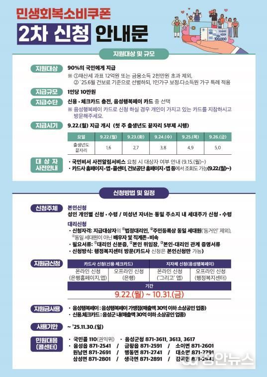 정안뉴스 황은경 기자 | 음성군은 이달 22일부터 2차 민생회복 소비쿠폰을 지급한다.