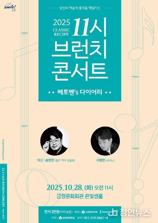 정안뉴스 황정혜 기자 | 부산시 금정구는 금정문화회관 은빛샘홀에서 펼쳐질 10월의 브런치 콘서트가 '베토벤’s 다이어리'라는 특별한 주제로 28일 오전 11시에 관객들을 찾아온다고 18일 밝혔다.